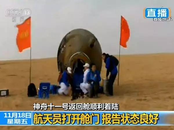 北京时间今天(11月18日)13时59分,神舟十一号载人飞船返回舱在内蒙古中部预定区域成功着陆,执行飞行任务的航天员景海鹏、陈冬身体状态良好。中国载人航天工程有关负责人表示,天宫二号与神舟十一号载人飞行任务圆满成功!