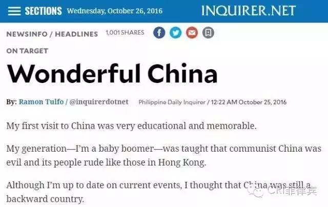 《菲律宾每日问询者报》10月25日一篇题为《美妙中国 》文章,作者名叫拉蒙•杜尔夫,是此次跟随杜特尔特访华团的成员。在文章中,他分享了在中国的见闻和感观: