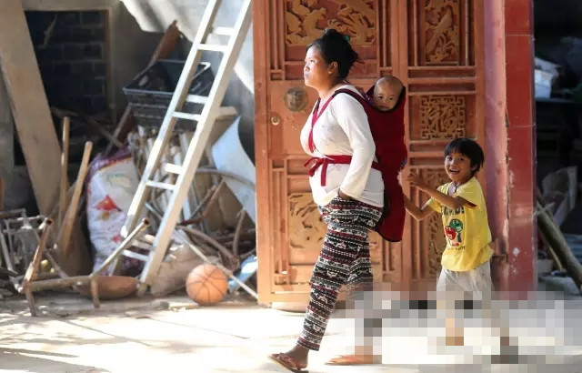 胡谋辉(音)紧跟着带弟弟散步的妈妈。