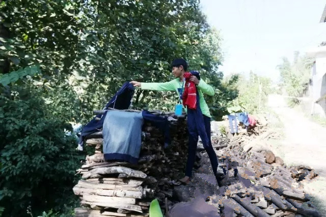 缅甸小伙子段三正在收洗好的衣服,他准备和伙伴们返回边民安置点。