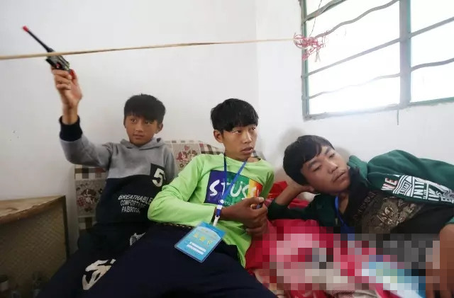 16岁的缅甸小伙子杨虎(下图右一)带着他在灾民安置点刚刚认识的小伙伴们也来到小姑娘胡谋辉寄住的人家洗澡充电。他的父亲同样在为这家房东打工。杨虎(右一)、段三(中)脖子上都挂着边民安置点发的安置证。上面有他们的姓名和编号,凭证才能出入安置点并领取物资和食物。他们说安置点现在人太多了,没有洗澡条件,手机充电也要排很长的时间。