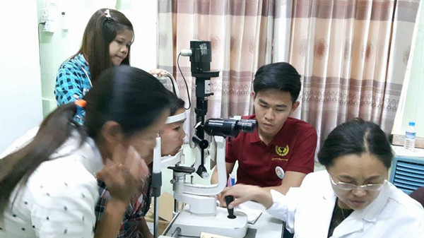 最近与位于曼德勒市西边的实皆省敏目镇‘提桑’眼科医院的‘缘分’竟是这样戏剧性地发生:一次‘偶然’的机会,在侨领贾思义先生夫妇的带领下(那天他们为医院捐款,资助眼病病患者),首次与敏目‘提桑’医院‘结缘’;随后与医院的‘院主’主持高僧‘鹏鹏’见面交谈,由陌生到‘知交’,由新奇到敬仰,最后为他的‘菩萨心肠’所‘迷倒’;再后来,总领馆终于决定今年云南省友协的‘光明行’便在此地举办,因为这里有意想不到的‘患者源’(根据鹏鹏介绍,这里由于地理气候社会等各种因素,白内障病患者最多,医院每天在为100人病例在动手术,预诊病人已排至明年3-4月份);之前,总领馆还特为医院捐赠‘爱心水站’净水直饮系统;之后,‘光明行’即将来临之际,与‘鹏鹏’商量,为其医护职员开办‘汉语班’;12月12日,‘光明行’活动启动仪式隆重举行,总领事、侨领都参加,受到医护人员的‘送上鲜花夹道欢迎’,规格甚高,场面壮观,活动影响深远;12月16日,与华助中心主任一起,再次前往医院,看望中国医师以及刚派去的‘小志愿者’们,了解‘光明行’的进展 。