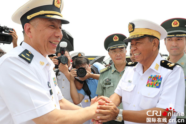 编队指挥员沈浩少将与缅甸海军船坞基地司令敏乌少将亲切握手(洪荃诠 摄)