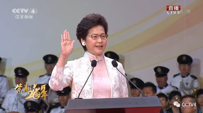 本人林郑月娥,谨此宣誓:本人就任中华人民共和国香港特别行政区行政长官,定当拥护《中华人民共和国香港特别行政区基本法》,效忠中华人民共和国香港特别行政区,尽忠职守,遵守法律,廉洁奉公,为香港特别行政区服务,对中华人民共和国中央人民政府和香港特别行政区负责。
