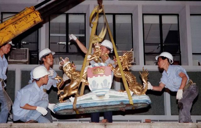香港中区政府合署大楼门前巨大的铜制英皇冠徽号被拆除。新华社记者李开远摄