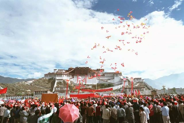 1997年7月1日,拉萨各族各界万余人在布达拉宫广场集会,庆祝香港回到祖国的怀抱。新华社记者觉果摄