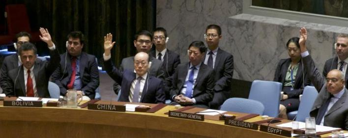 由美国提交对朝制裁决议案获得联合国安理会15个成员国一致通过 中国常驻代表刘结一(左二)在表决时举手表示赞成