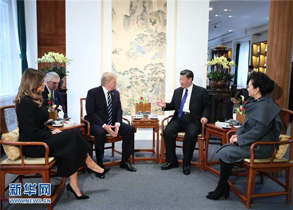 11月8日下午,国家主席习近平和夫人彭丽媛在北京故宫博物院迎接来华进行国事访问的美国总统特朗普和夫人梅拉尼娅。两国元首夫妇在宝蕴楼简短茶叙。新华社记者 谢环驰 摄