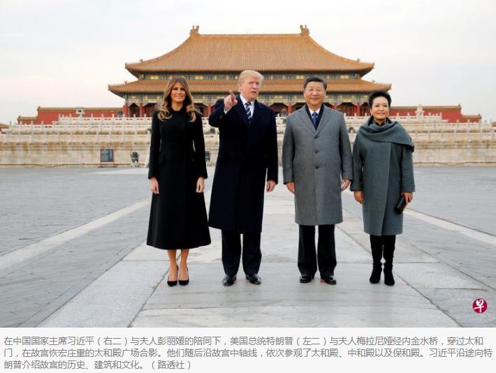 美国总统特朗普昨天下午抵达北京展开为期三天的国事访问,中国国家主席习近平特意为特朗普安排了在故宫茶叙及晚宴,款待规格明显超越其前任。
