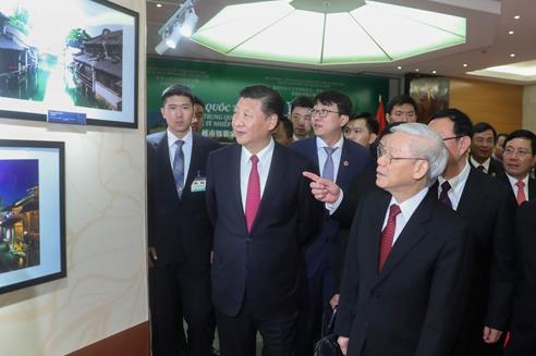 宴会前,习近平和阮富仲共同参观“越南摄影家眼中的中国”摄影展。