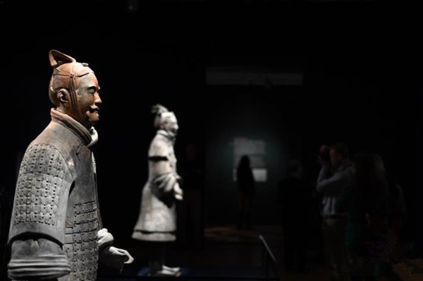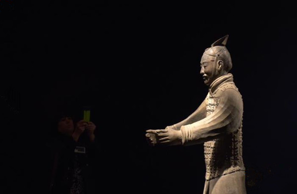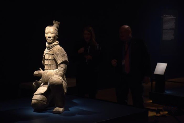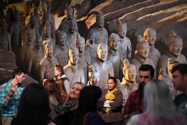 11月15日,人们在美国弗吉尼亚州首府里士满的弗吉尼亚艺术博物馆观看兵马俑特展。当日,美国弗吉尼亚艺术博物馆举办兵马俑特展媒体预展。主题为“辉煌大秦——兵马俑”的特展将于11月18日正式对公众开放,展品多达130余件,将展出将军俑、铠甲俑、陶马俑、立射俑、跪射俑和文官俑等10件兵马俑真品,以及各式青铜兵器、礼器、祭器、金银器、玉器、陶器和建筑构件。