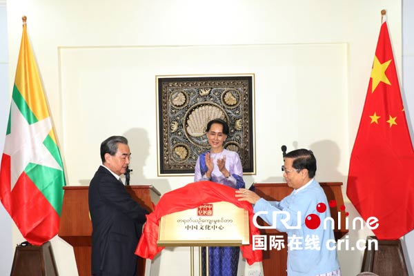 王毅和缅甸宗教事务与文化部部长都拉吴昂哥共同为中国文化中心揭牌