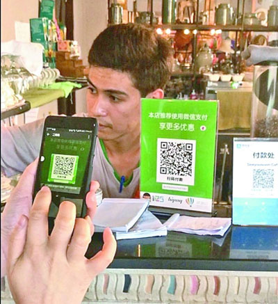 在泰国清迈一家酒吧,顾客通过微信扫码支付。新华社发