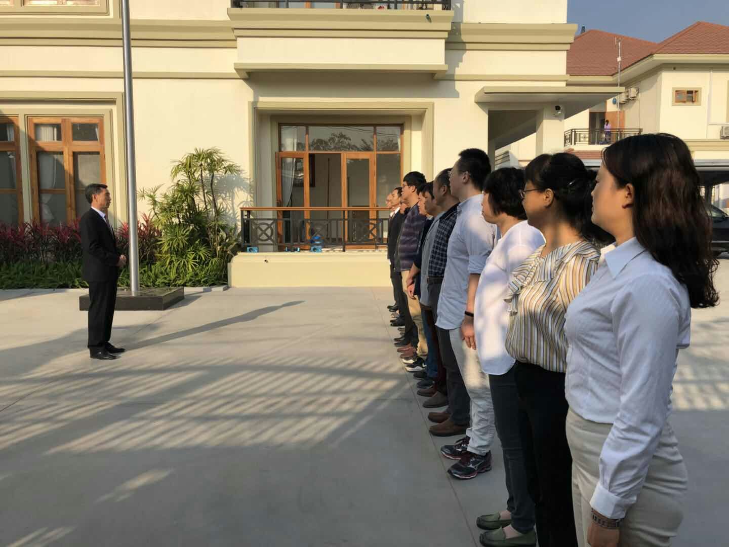 2018年2月5日,中国驻曼德勒总领馆是迁入新馆的第一个周一,早晨8时30分,举行庄严的升国旗仪式,庆祝顺利迁入新馆,感谢祖国和人民的关怀,遥祝伟大祖国更加繁荣富强。来馆工作的外交部技术小组和全体馆员、家属参加仪式。