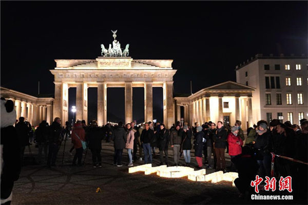 3月24日晚,人们聚集在德国柏林标志性建筑勃兰登堡门前等待灯光熄灭的一瞬。中新社记者 彭大伟 摄
