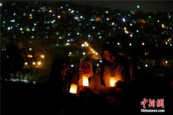 在约旦安曼城堡,民众在熄灯时手捧蜡烛,响应“地球一小时”活动。