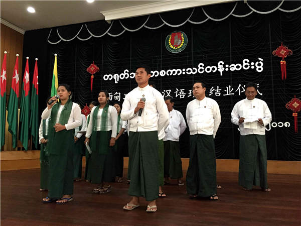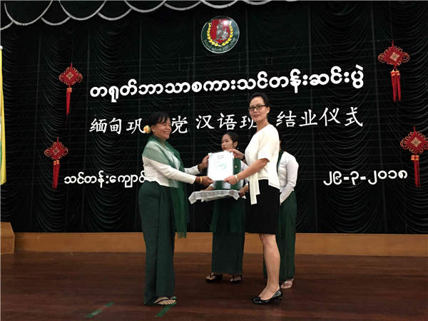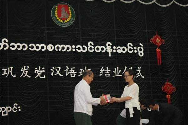 结业仪式上,李小艳公参向巩发党学员代表颁发了结业证书,并向缅方赠送了介绍中国文化的纪录片DVD光碟。巩发党学员们现场表演了中文歌曲和中文诗歌朗诵。