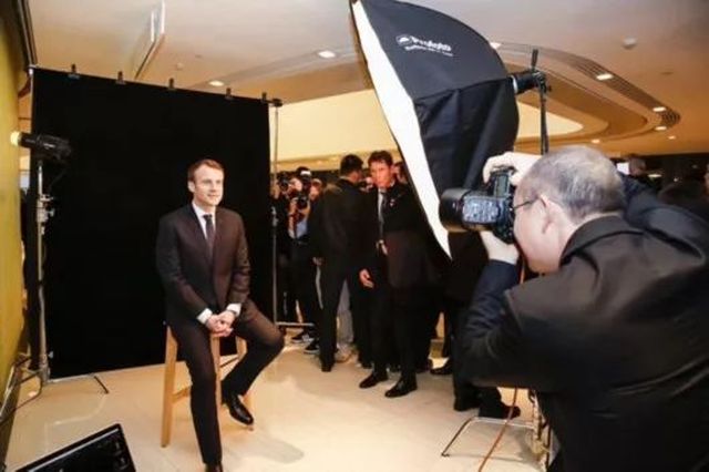 ▲资料图片:2018年1月9日,北京,中法人工智能论坛和经贸签约仪式上,SOHO中国董事长潘石屹给法国总统马克龙拍摄证件照。