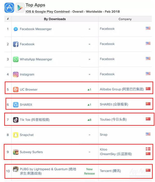 在最近新公布的的2月全球App最热榜单中,前十位里中国的手机软件APP就占了4.5个。