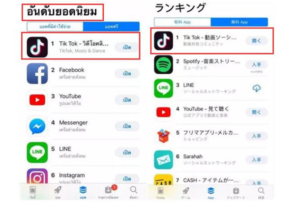 前几天公布的最新下载量排名上,Tik Tok在泰国和日本的App Store下载量上都是登顶。