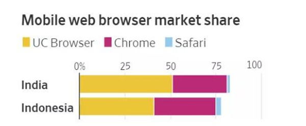 在印度市场,UC浏览器的市场占有率达到51%;在印尼,UC也以41%的市场份额完胜谷歌。