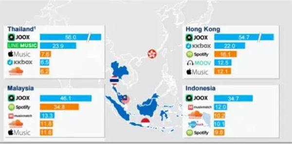 在中国香港、马来西亚、印尼和泰国四个音乐APP市场,JOOX已经名列前茅,抢占了东南亚移动音乐市场半壁江山。