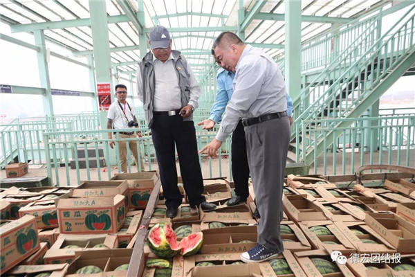 4月21日上午,正值缅甸水果出口旺季,两国记者在缅甸105码贸易区看到,排成长龙的西瓜、香瓜、芒果运输车在105码联检中心等待办理出境手续,两国记者走访了贸易区,并对105码商贸处处长吴敏都亚以及木姐-南坎商会会长吴赛嫩、木姐旅游协会会长吴钦貌伍进行了专访。结束木姐的采访后,两国记者来到位于中方一侧的畹町口岸芒满货运通道和畹町水果批发市场,缅甸105码出口的水果正是通过两国口岸运往这里进行分装后再运往中国内地。据介绍,每天有800多辆货车从畹町芒满货运通道进入中国,高峰期可达2000辆。今年缅甸将出口100万吨水果到中国,而其中西瓜占比70%左右。两国记者通过走访中缅两国最大的陆路口岸,感慨两国近年来贸易往来的广度与深度,对目前“一带一路”大通道建设中存在的困难和问题进行了深入了解。