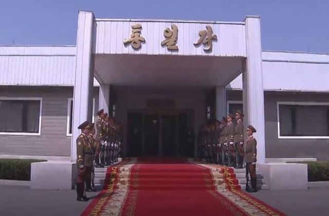 另据青瓦台发布的会晤照片和视频资料显示,文在寅当天乘车抵达板门店朝方一侧统一阁,朝鲜劳动党中央委员会第一副部长金与正在统一阁前迎接。朝鲜人民军礼兵整齐排列在统一阁正门入口两侧。