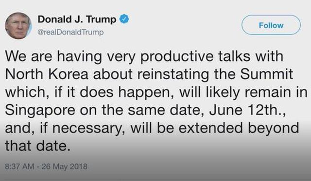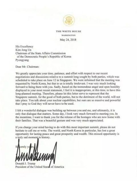 特朗普24日在给金正恩的一封公开信里宣布,取消两人原定于6月12日的新加坡会晤。