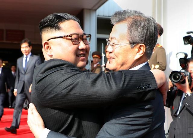 韩国国家情报院院长徐薰和朝鲜劳动党中央委员会副委员长金英哲陪同会晤。会晤结束后,文在寅与金正恩在统一阁前拥抱话别。