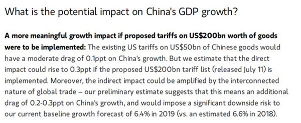 而在“间接影响”方面,贸易全球化的特质则会令特朗普的2000亿关税攻势对我国GDP额外造成0.2到0.3个百分点的影响。那么其最终的结果,用摩根斯坦利这份报告的原话说就是“会给我们目前做出的中国2019年6.4%的GDP增长预期带来显著的下行风险”。