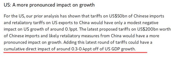 这份报告指出,目前美国对中国价值340亿美元的产品施加的25%的制裁关税,会导致中国的GDP下降0.1个百分点。但如果美国总统特朗普继续对价值2000亿美元的中国产品征收10%的关税,那么这对中国GDP的“直接影响”就会增加到0.3个百分点。