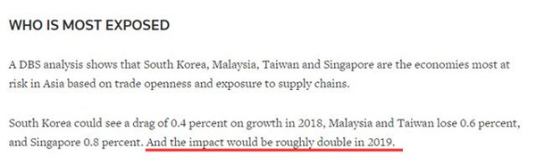 值得一提的是,路透社今天发布的一篇最新报道还引用新加坡“星展银行”的分析,介绍了特朗普对华发动贸易战的做法会给哪些其他国家和地区带来损失,其中包括韩国、马来西亚、台湾和新加坡。