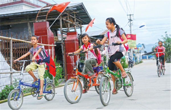 ▲瑞丽市姐相乡银井小学的几名学生骑着自行车在去学校的路上(2011年5月26日摄)。