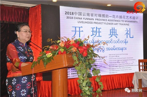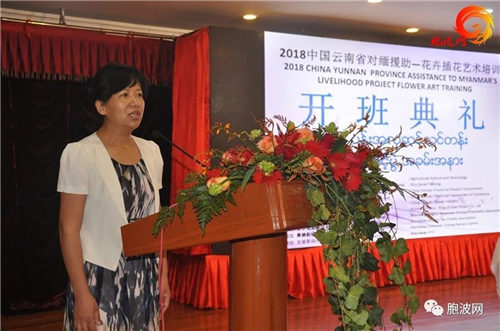 中国驻曼德勒总领事馆杨晟领事讲话时表示,刚进入大厅,就看到这么多的学员,准备参加花艺班的学习,对此她本人感到十分激动。这表示,缅甸民众对美好生活的追求还是十分强烈。杨领事说,学习插花艺术,不仅是一门谋生技能,还是体验美好生活的一种艺术,并且对环境保护也是一种动力。她鼓励学员们努力学习,创造美好未来。她代表总领事馆向云南省人民政府、云南省商务厅举办的此次“插花艺术培训班”表示热烈的祝贺。