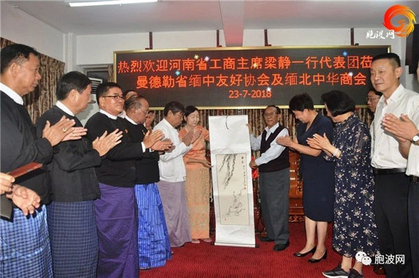 接下来,河南省工商会与曼德勒省缅中友协以及缅北中华商会还互相交换了纪念品。最后,在金多堰大礼堂,还设晚宴招待了河南省工商会一行。