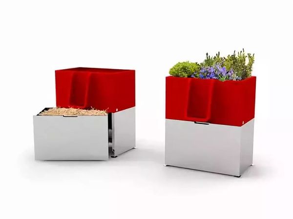 红色部分是小便池,上面长满了花草,下面的盒子则装满了秸秆、锯末或木屑。