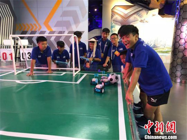 图为老挝足球队球员体验机器人足球项目。 刘旭 摄