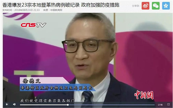 8月23日,香港卫生防护中心报告新增4例登革热本地病例。2018年截至8月23日,香港共报告23例登革热本地病例,61例输入性病例。