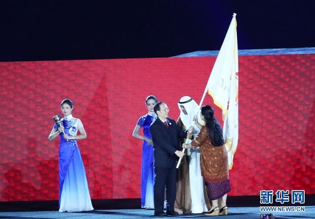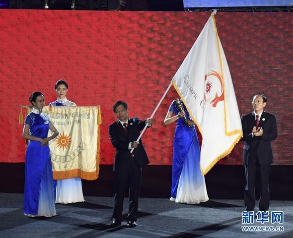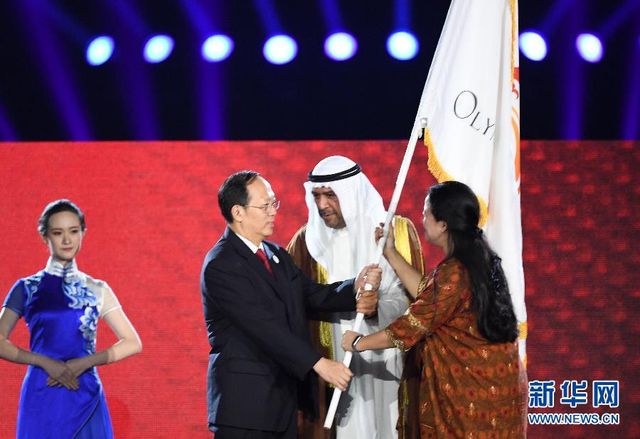 ↑这是闭幕式上的亚奥理事会会旗交接仪式。 新华社记者杜宇摄