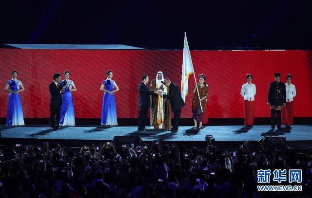 ↑9月2日,第18届亚运会闭幕式在印度尼西亚雅加达举行。 这是闭幕式上的亚奥理事会会旗交接仪式。 新华社记者兰红光摄
