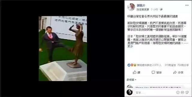 王炳忠还在其脸书中曝光,踢踹慰安妇铜像的始作俑者藤井实彦回骂网友的言论。面对岛内网友批“恶心”“无耻”的言论,藤井实彦在社交媒体上用英文反呛,慰安妇才恶心,还宣称根本没有慰安妇,都是韩国人编造的谎言等,不过很快,藤井又把帖子删了。