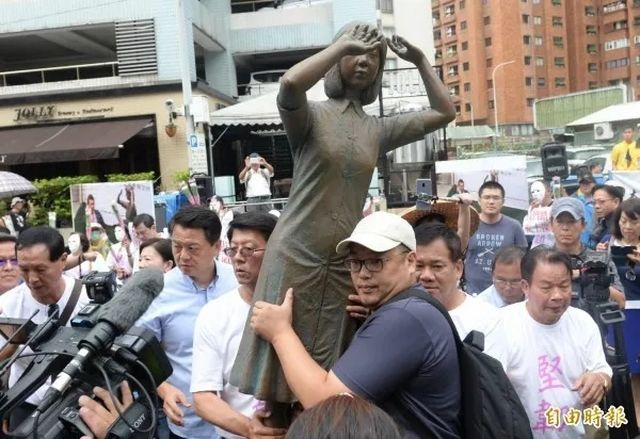 谢龙介率众扛起慰安妇铜像到“台日交流协会”抗议。