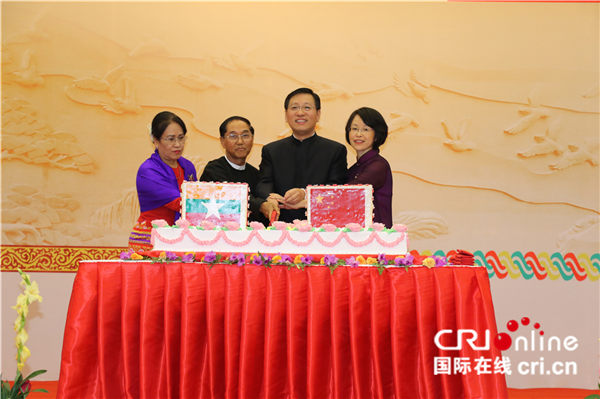 中国驻缅大使洪亮夫妇及缅甸副总统敏瑞夫妇在使馆国庆招待会上共同为中国庆生切下蛋糕(摄影 洪荃诠)