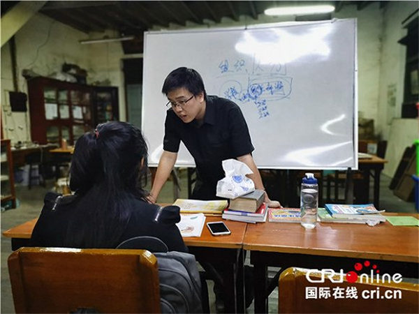 来自甘肃兰州的郭奕俊从2014年大学本科毕业开始就一直在海外担任中文教师志愿者,原来是在泰国,后来来到缅甸,他没有选择在大城市仰光任教,而是来到条件更为艰苦的勃生。他所任教的勃生勃华语言与电脑学苑开设在勃生市中心的福建同乡会三层小楼里。教室和他的宿舍都在二层,宿舍差不多有10平方米,条件很简陋,有空调和WIFI,但是没有自来水,经常会停电。