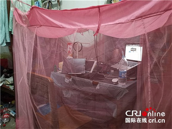 在他杂乱的宿舍里最干净的是一张书桌,上面摆着笔记本电脑、IPAD、电子书、游戏机,书桌上挂了一个红色的蚊帐,他说:“因为这个房间并不是完全密封的,蚊子很多,我就在自己工作的地方挂一个蚊帐,躲在蚊帐里面,就是我的天地。”