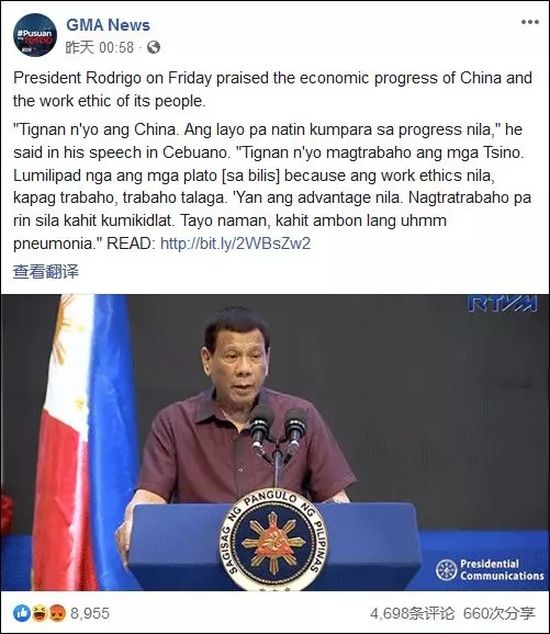 菲律宾总统杜特尔特称赞中国的经济发展和中国人民的工作态度,鼓励当地民众学习。