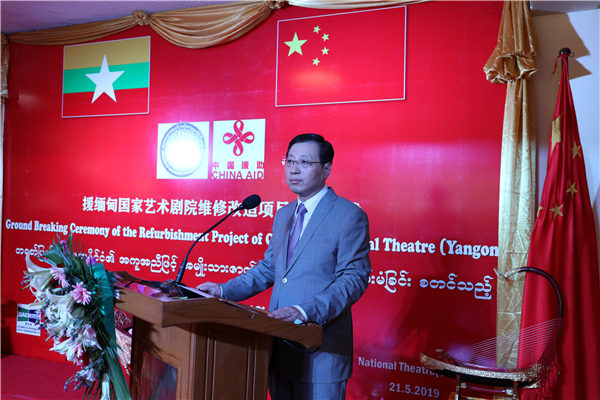 5月21日,中国援缅甸国家艺术剧院维修改造项目开工仪式在仰光隆重举行。中国驻缅甸大使洪亮、缅甸宗教事务与文化部长昂哥、仰光省首席部长漂敏登、宗教事务与文化部副部长季民出席活动并为开工仪式剪彩。