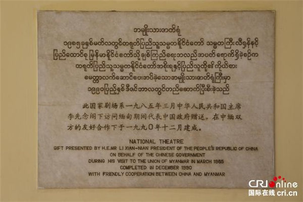缅甸国家剧院铭牌:该剧院由中国援建,1985年签约,1990年建成投入使用