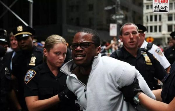 上图:美国纽约警方当场限制示威者的“人身自由”。